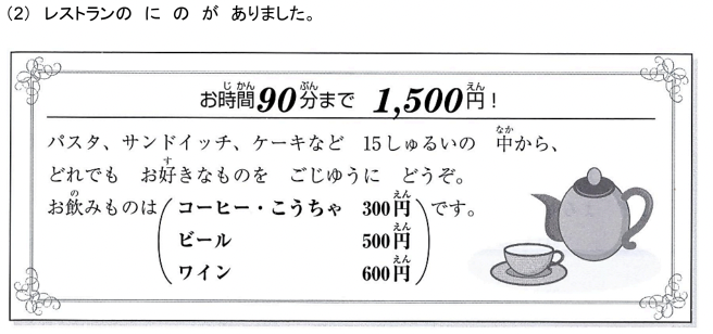 - の ことばは ひらがなで どうかきますか。1・2・3・4から いちばん いい ものを ひとつ えらんで ください。